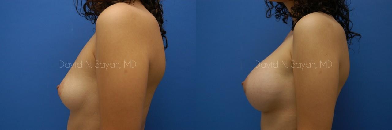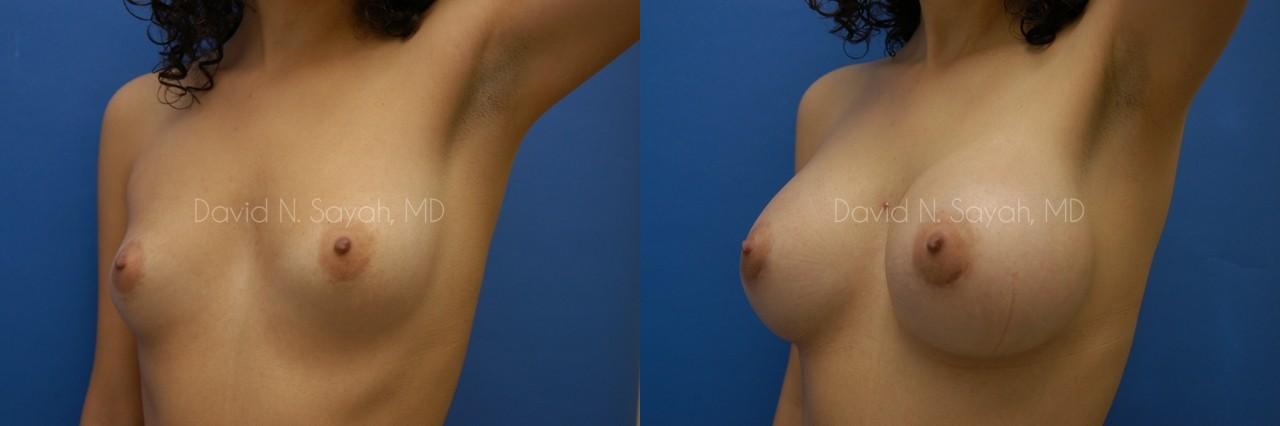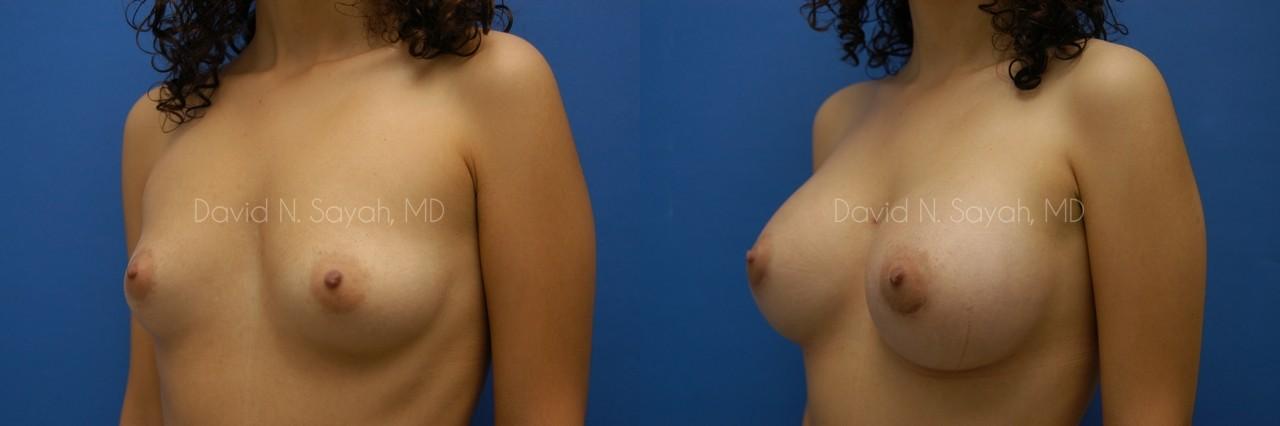 This 28-year-old young woman came to the office of Dr. David Sayah for a consultation for breast augmentation because she was unhappy with the size and the appearance of her breasts. At the time of her consultation she was a size A cup but wanted to increase the size of her breasts to a full C or small D cup.