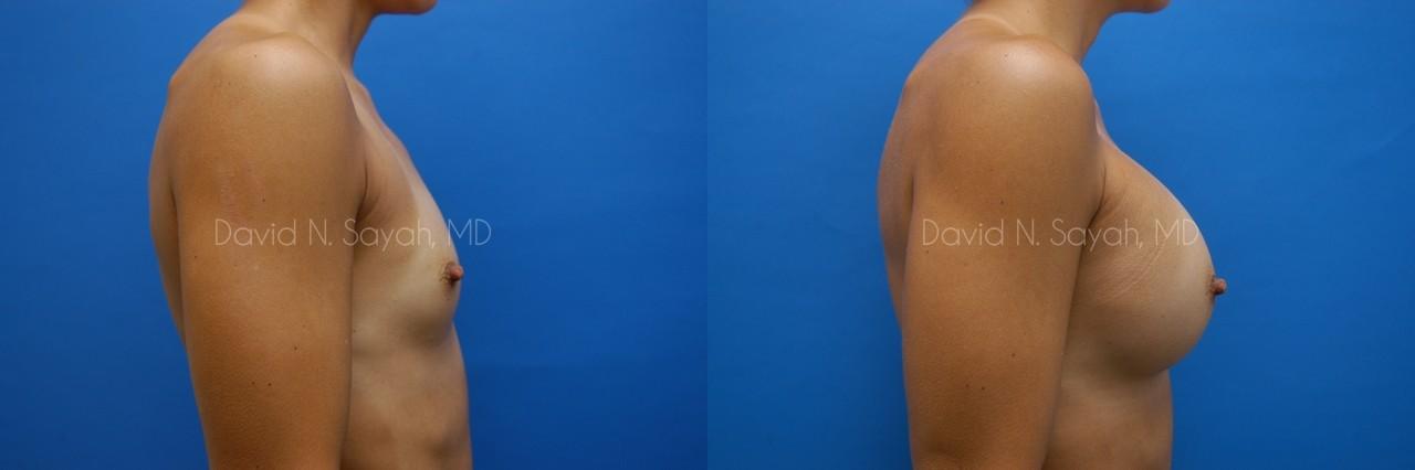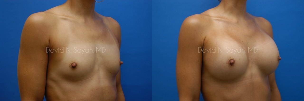 This 38-year-old woman came to our Beverly Hills office interested in a breast augmentation. She didn’t like the size of her small breasts and hoped to move from a size A cup to a full C or D cup. During her consultation with the doctor, she asked questions about the different size and material options for her surgery. They discussed the different options for incision including through the armpit, through the nipple and through a fold under the breast. Dr. Sayah noted that the patient’s left breast was slightly larger than her right and agreed that an augmentation would provide symmetry while also increasing her breast size to her desired cup size. After her consultation, the patient chose 450 cc smooth round silicone implants to be inserted through an incision made under her armpit and placed beneath her breast muscle. As you can see in the patient’s after photo, her breasts are larger (increased to a full C cup) and are now much more symmetrical. She is very happy with the outcome of her surgery.