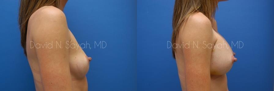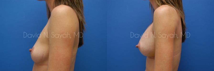 As you can see in the “after” photo, she has increased her cup size while still keeping a look that is natural to her frame and body type. Dr. Sayah was able to position the left implant higher under the muscle so that the distance between the left breast and sternum was descreased and the both breasts are more symmetrical. The patient loves her make over and is very happy with the results of her surgery