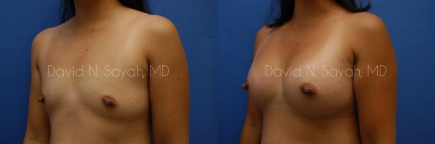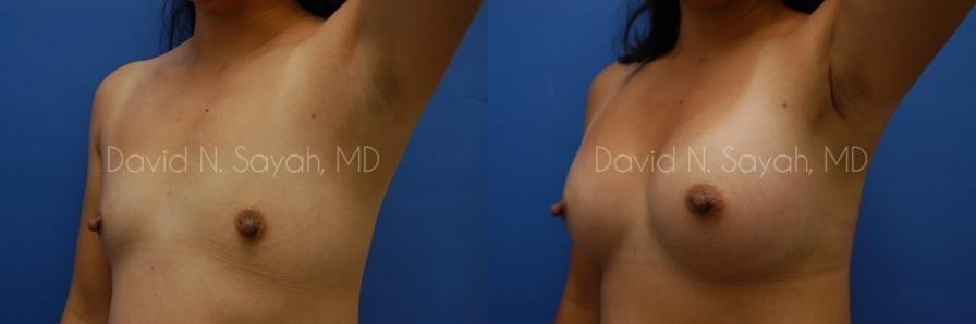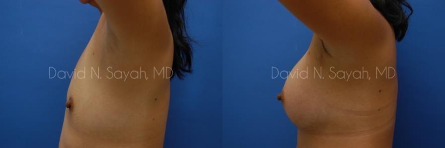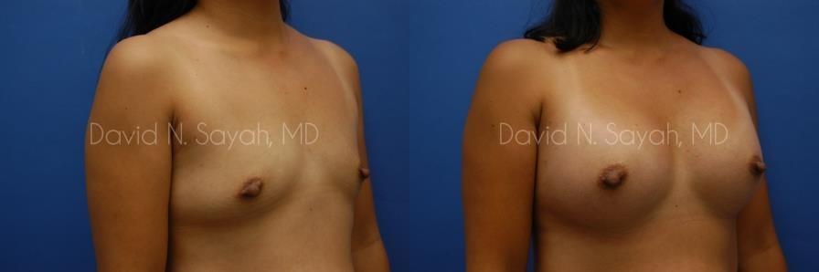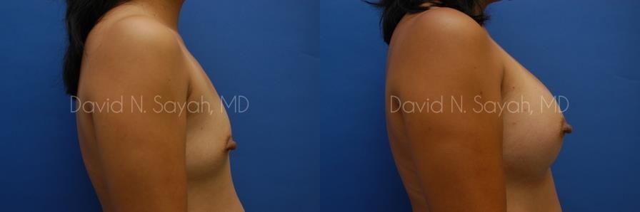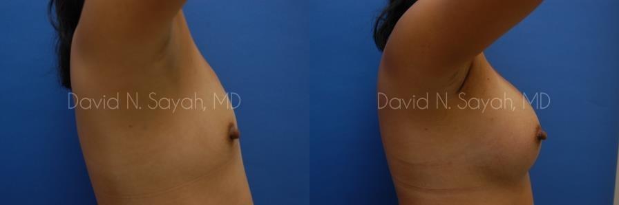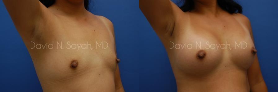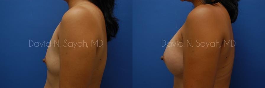 This 37-year-old woman came to the office of Dr. David Sayah with complaints about her small breasts. The patient felt that with age she had lost the youthful buoyancy and ampleness of her breasts. She was interested in breast augmentation at our Beverly Hills practice to add volume to her drooping breasts and hoped to increase her size to a full C cup.
