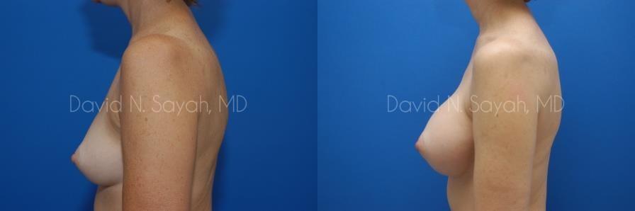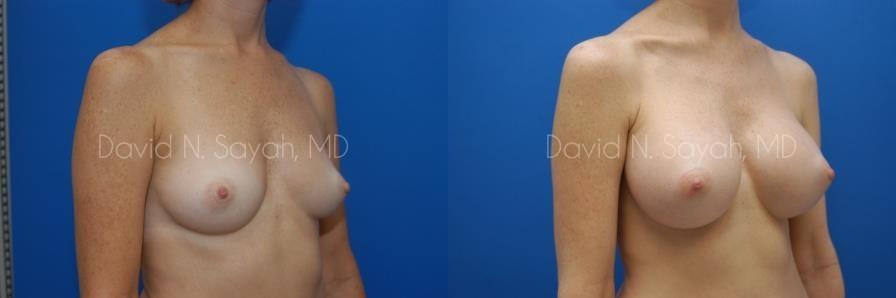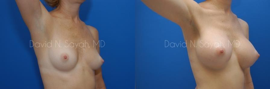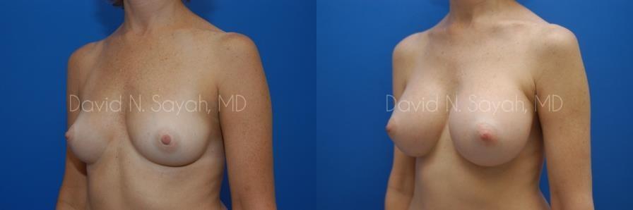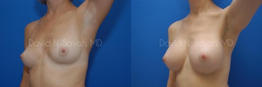 This 45-year-old woman requested a consultation with Dr. David Sayah because she didn’t like the size and shape of her breasts. The patient was a size 34 B and wanted to increase her cup size to a full C or D cup.