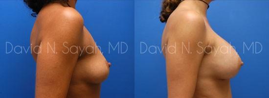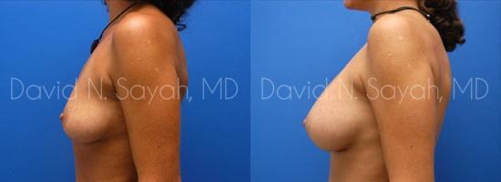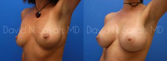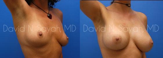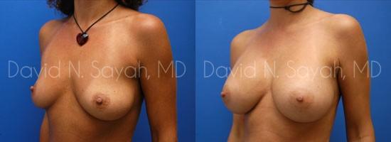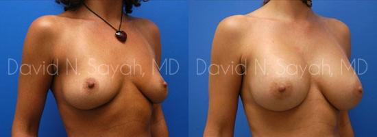 During her consultation with Dr. Sayah, the patient explained that she wanted to add about two full cup sizes to her current breast size but she worried about the scaring that surgery might leave. Dr. Sayah discussed the different locations for incisions and explained that he is careful to minimize the appearance of scarring regardless of where the patient chooses to have incisions placed. The patient chose armpit (transaxillary) incisions so she would have no scarring on her breasts. She chose 375 cc smooth round moderate profile saline implants placed beneath the breast muscle.