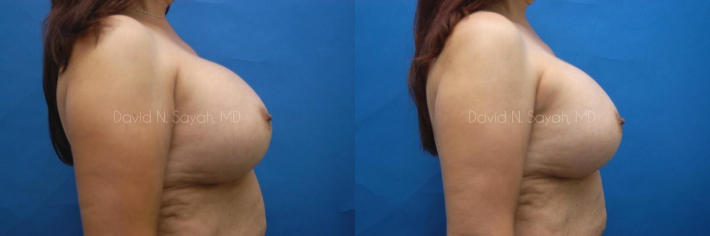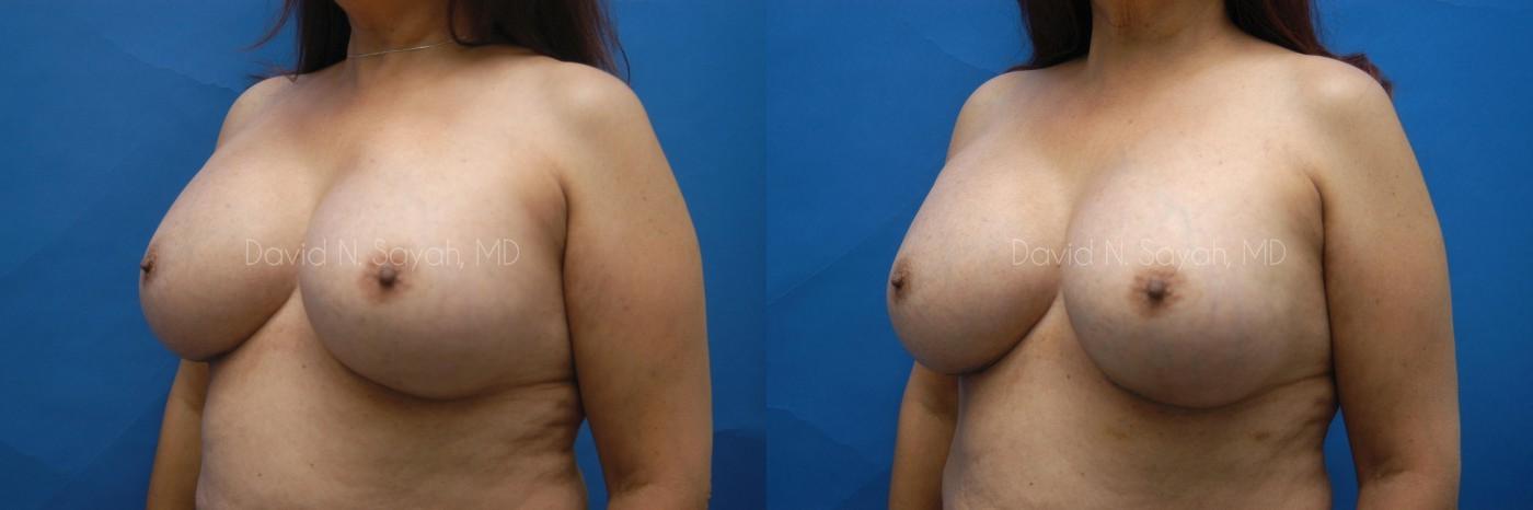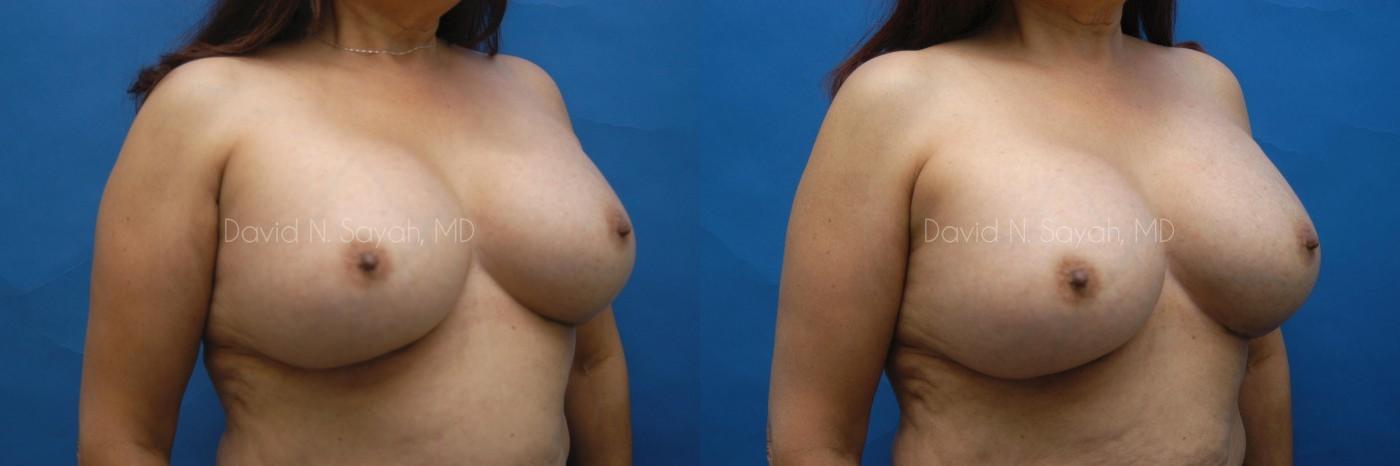 Patient had pain and hardness in breasts due to an augmentation performed by another surgeon several years prior. Dr. Sayah performed an implant exchange and capsulectomy to remove the painful scar tissue. This patient wished to maintain her current size but address the flattening near the scar on the right breast.