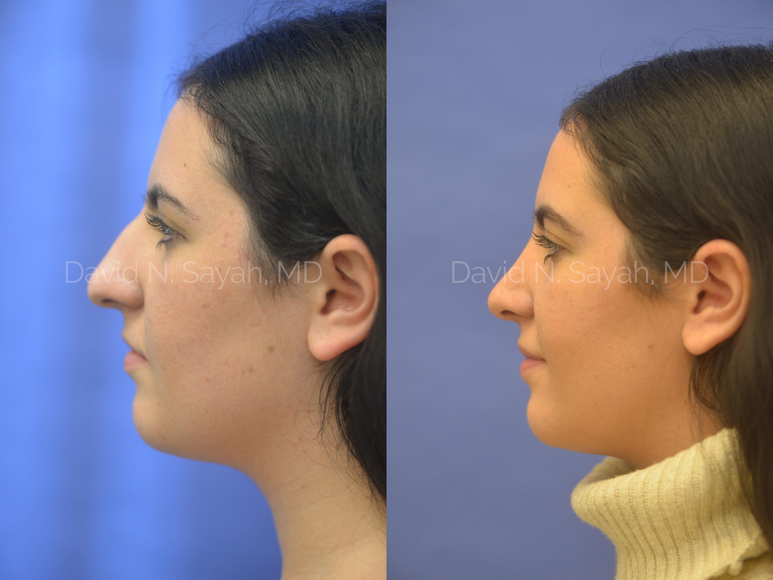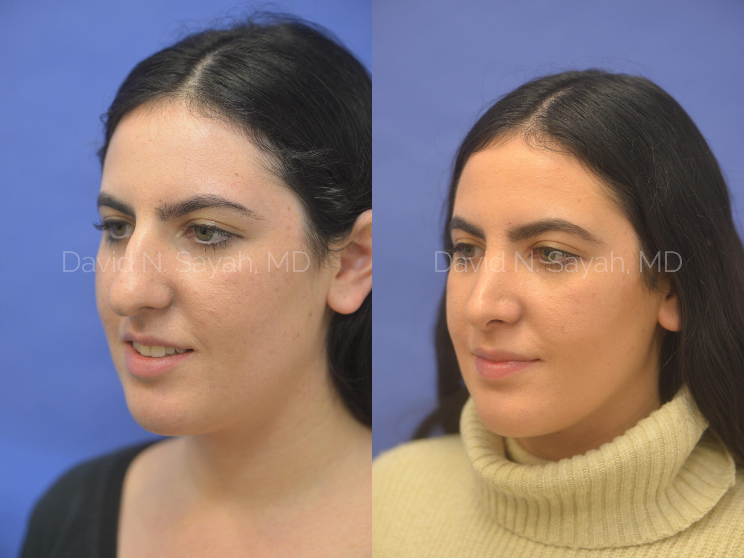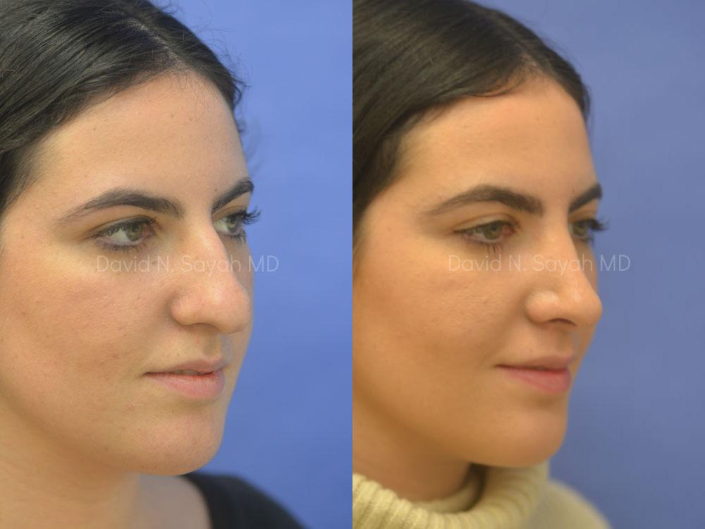 The patient is a 19-year-old female who presented to our office with difficulty breathing and a cosmetic concern for a large dorsal hump and a droopy tip. She underwent rhinoplasty, septoplasty, and turbinoplasty and achieved a more refined nose through which she can breathe better. Her nostrils were narrowed with a novel technique developed by Dr. Sayah which does not result in any scarring.