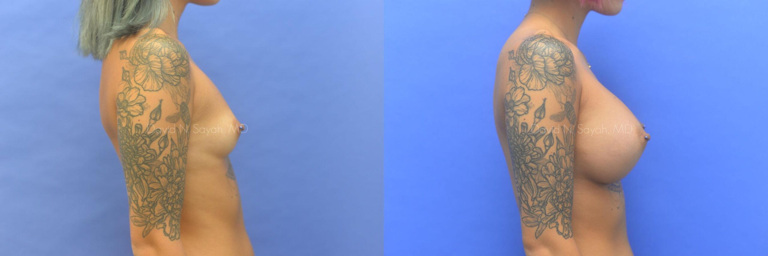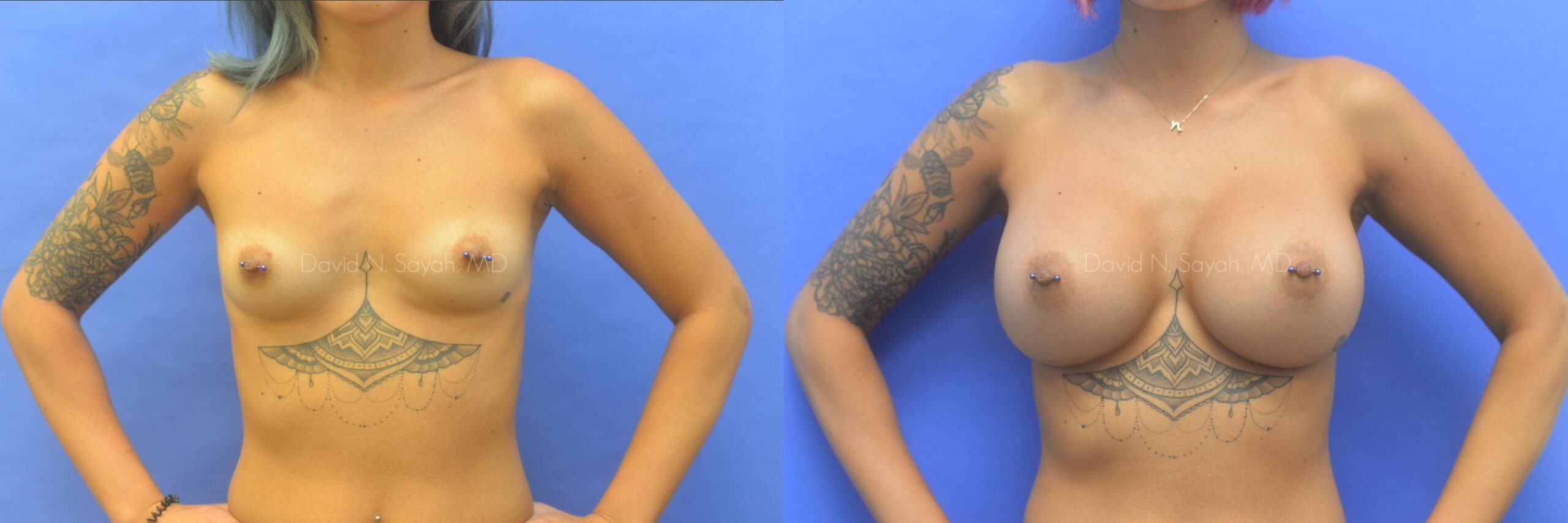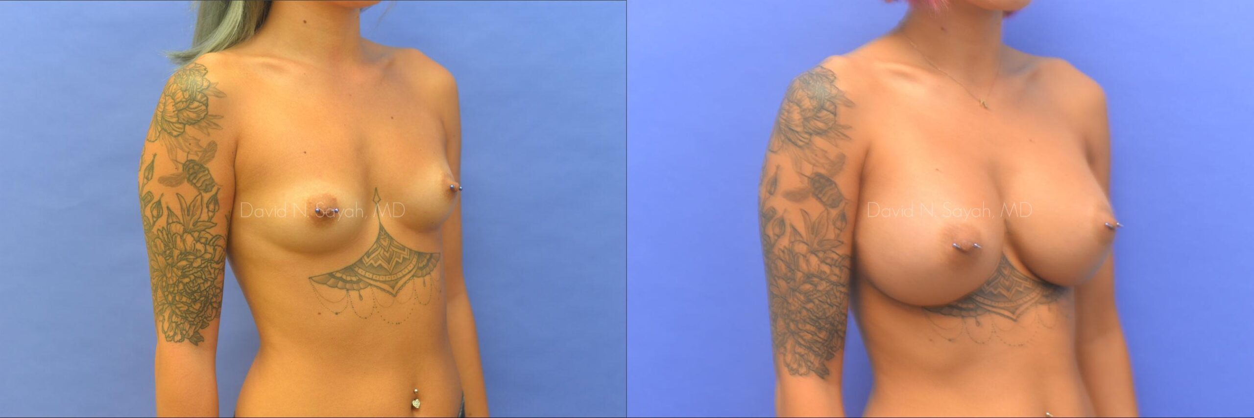 This patient is a 23 year old female presenting to our office with a desire for larger breasts. She underwent breast augmentation through an incision under her breasts using 450cc saline implants.