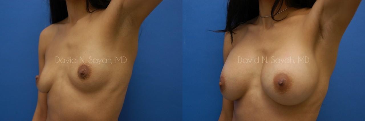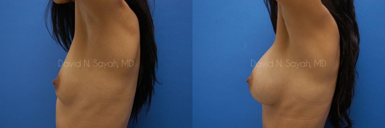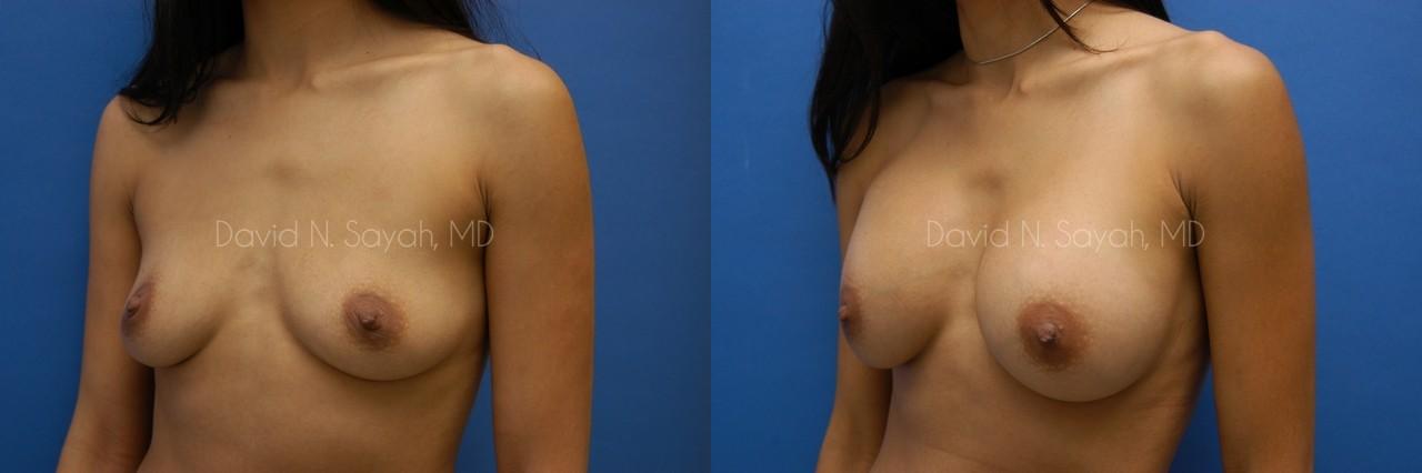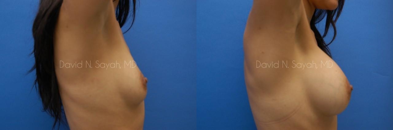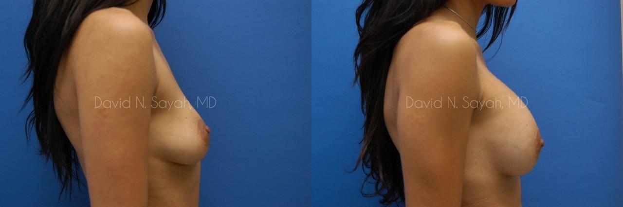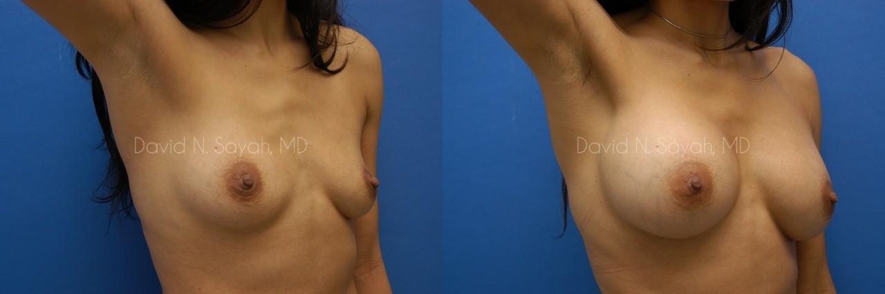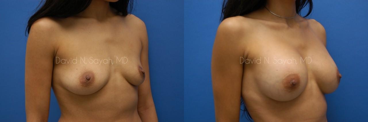 This 28-year-old woman came to the office of Dr. David Sayah requesting a consultation for breast augmentation. After two pregnancies, the patient felt that she had lost volume in her breasts with each pregnancy and hoped that implants would restore fullness to her drooping breasts. She wanted implants that would increase her cup size to a full C cup.